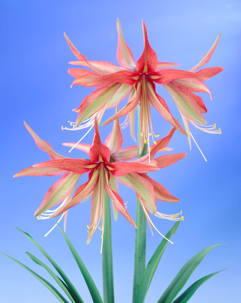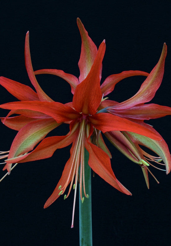 • Szín: egzotikus, mélyvörös szirmok keskeny, enyhén csavart formával és élénkzöld torokkal