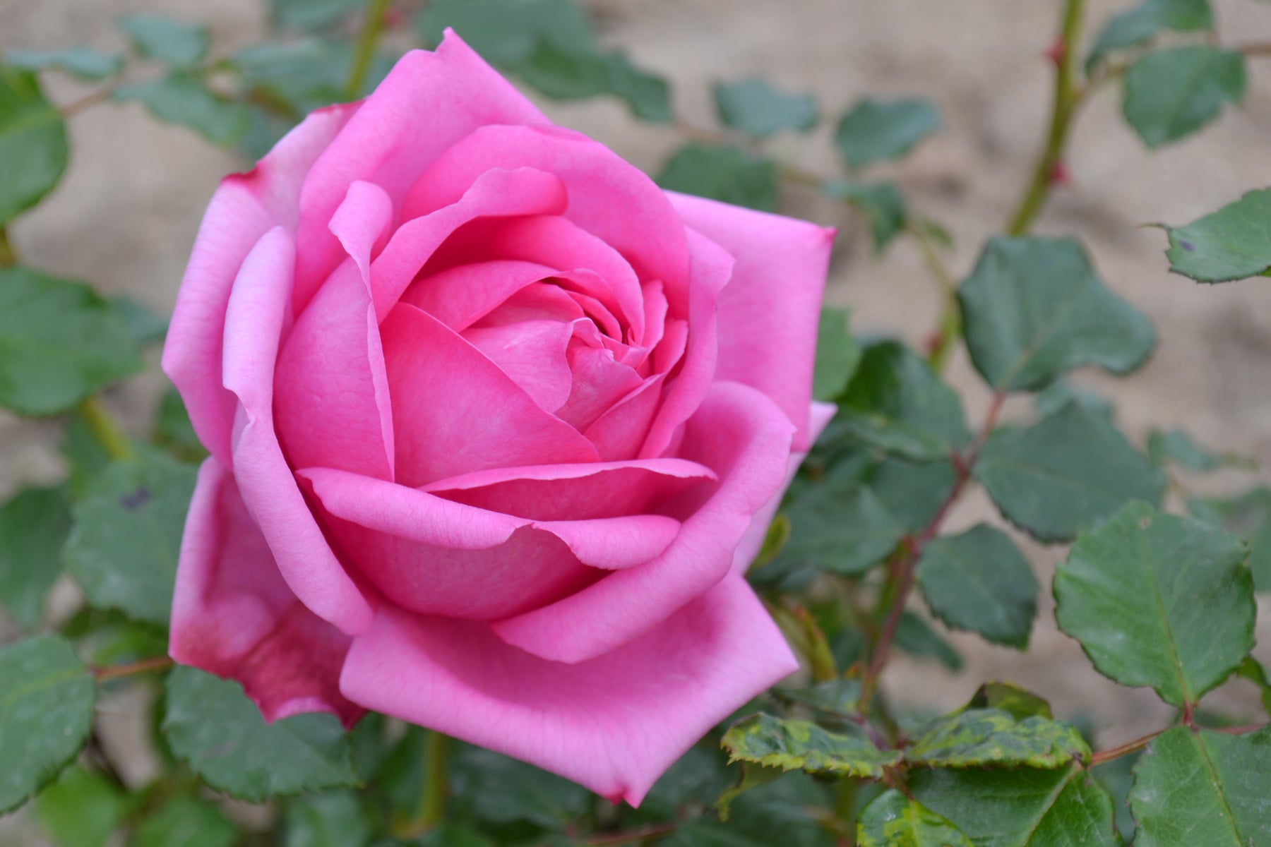 This hybrid tea rose forms a healthy, well-balanced bush with glossy dark green foliage and reaches 80 to 100 cm in height, making it ideal for borders, rose beds, or large containers.