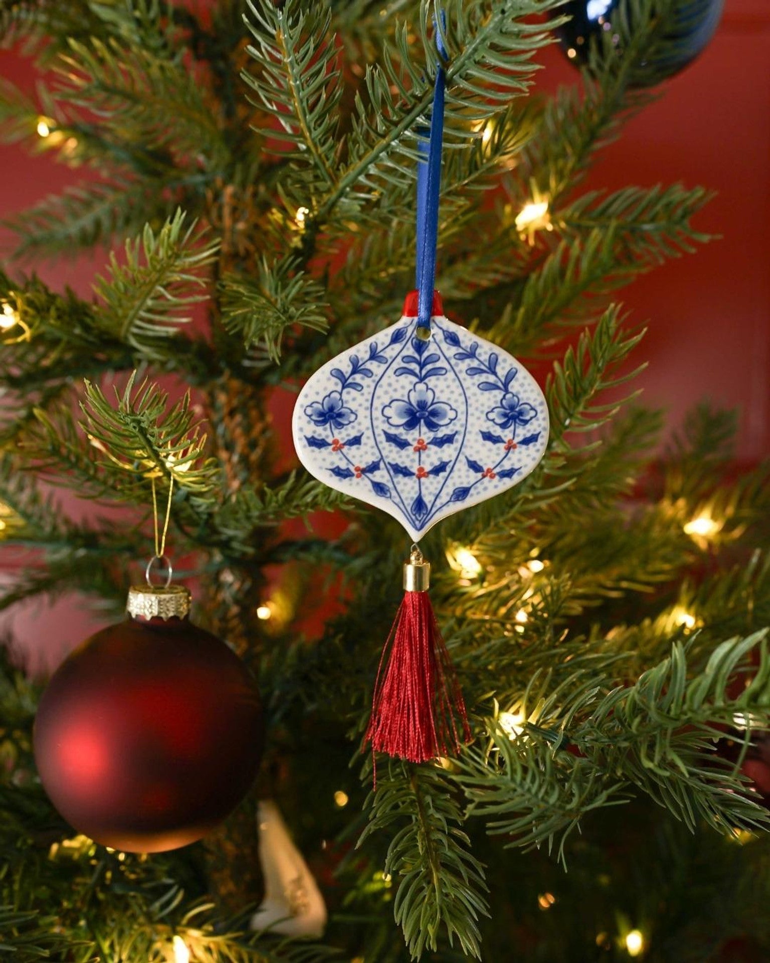 - Flat onion-shaped Christmas ornament with a vintage Delft blue design and red decorative accents