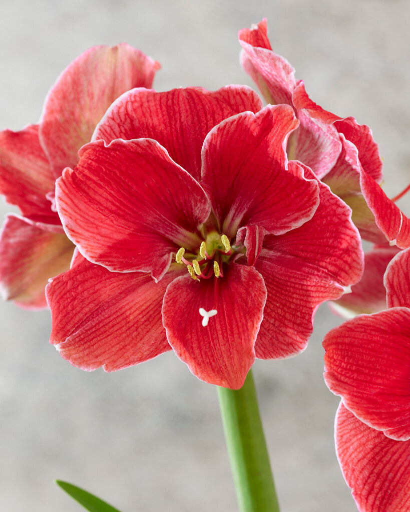 Szín: Élénkpiros szirmok fehér szegéllyel és finom fehér erezettel. A közepén világoszöld torok található.