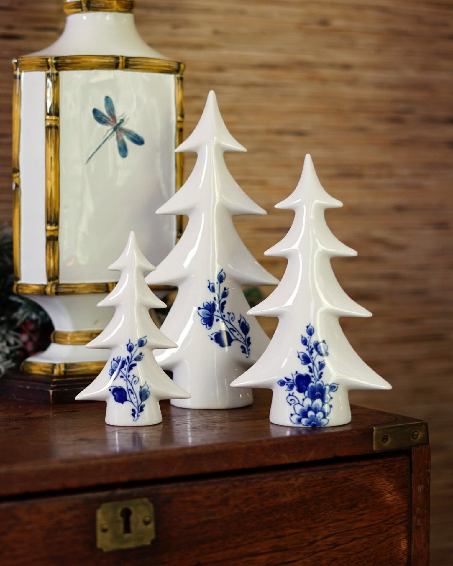 - Karácsonyfa figura elegáns ágakkal és visszafogott delfti kék díszítéssel